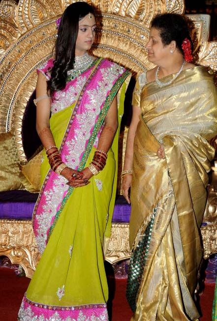 The reception of the much-awaited wedding of Jr NTR -Lakshmi Pranathi held at a grand setting erected at Hitex in Madhapur on Thursday evening. NTR is to tie the knot with Lakshmi Pranathi at 2.41 am (muhurtam) on Friday morning. True to the wishes of NTR the marriage venue resembles the ambience of a royal wedding which is unheard of in Tollywwod.