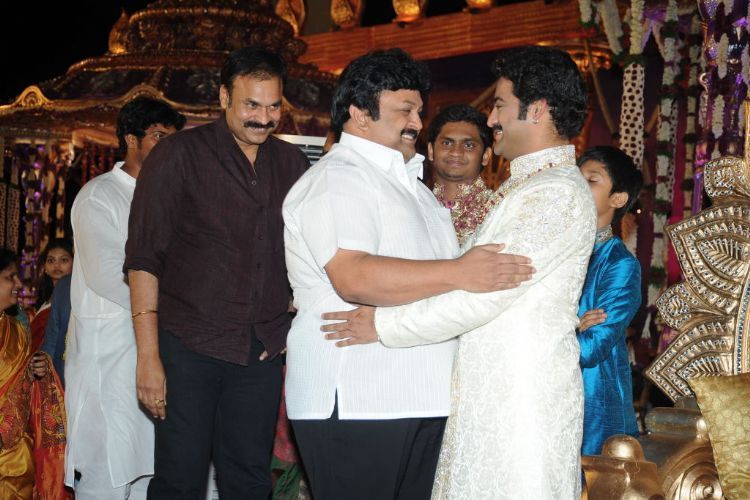The reception of the much-awaited wedding of Jr NTR -Lakshmi Pranathi held at a grand setting erected at Hitex in Madhapur on Thursday evening. NTR is to tie the knot with Lakshmi Pranathi at 2.41 am (muhurtam) on Friday morning. True to the wishes of NTR the marriage venue resembles the ambience of a royal wedding which is unheard of in Tollywwod.