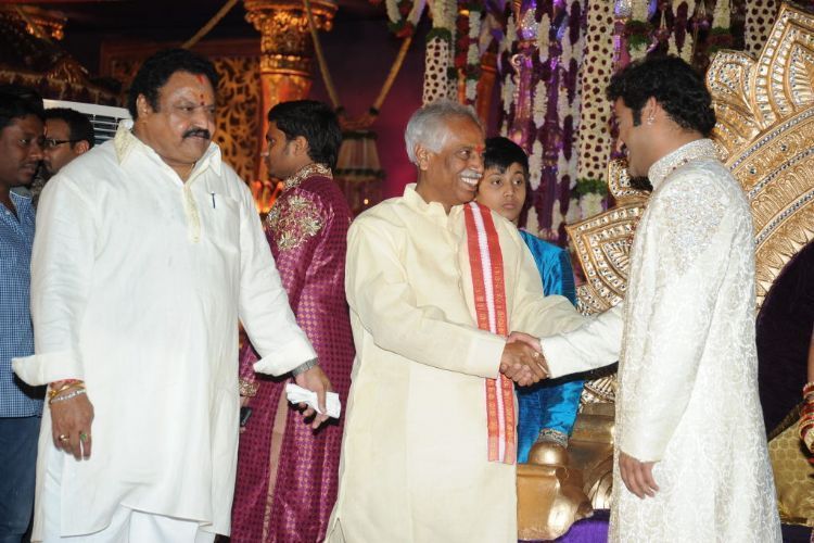 The reception of the much-awaited wedding of Jr NTR -Lakshmi Pranathi held at a grand setting erected at Hitex in Madhapur on Thursday evening. NTR is to tie the knot with Lakshmi Pranathi at 2.41 am (muhurtam) on Friday morning. True to the wishes of NTR the marriage venue resembles the ambience of a royal wedding which is unheard of in Tollywwod.
