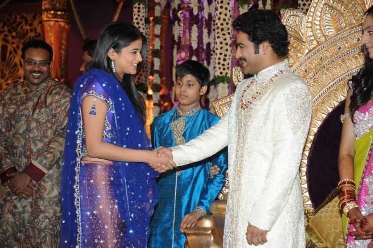 The reception of the much-awaited wedding of Jr NTR -Lakshmi Pranathi held at a grand setting erected at Hitex in Madhapur on Thursday evening. NTR is to tie the knot with Lakshmi Pranathi at 2.41 am (muhurtam) on Friday morning. True to the wishes of NTR the marriage venue resembles the ambience of a royal wedding which is unheard of in Tollywwod.