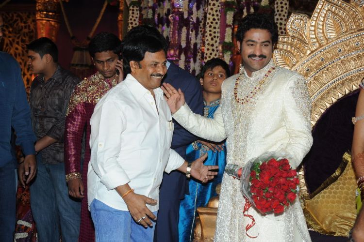 The reception of the much-awaited wedding of Jr NTR -Lakshmi Pranathi held at a grand setting erected at Hitex in Madhapur on Thursday evening. NTR is to tie the knot with Lakshmi Pranathi at 2.41 am (muhurtam) on Friday morning. True to the wishes of NTR the marriage venue resembles the ambience of a royal wedding which is unheard of in Tollywwod.