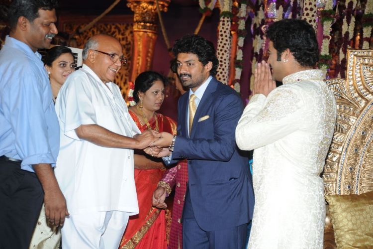 The reception of the much-awaited wedding of Jr NTR -Lakshmi Pranathi held at a grand setting erected at Hitex in Madhapur on Thursday evening. NTR is to tie the knot with Lakshmi Pranathi at 2.41 am (muhurtam) on Friday morning. True to the wishes of NTR the marriage venue resembles the ambience of a royal wedding which is unheard of in Tollywwod.