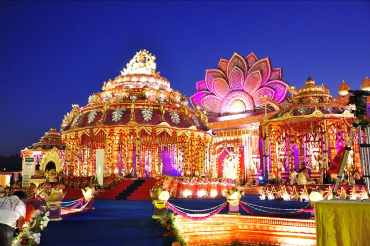 The reception of the much-awaited wedding of Jr NTR -Lakshmi Pranathi held at a grand setting erected at Hitex in Madhapur on Thursday evening. NTR is to tie the knot with Lakshmi Pranathi at 2.41 am (muhurtam) on Friday morning. True to the wishes of NTR the marriage venue resembles the ambience of a royal wedding which is unheard of in Tollywwod.