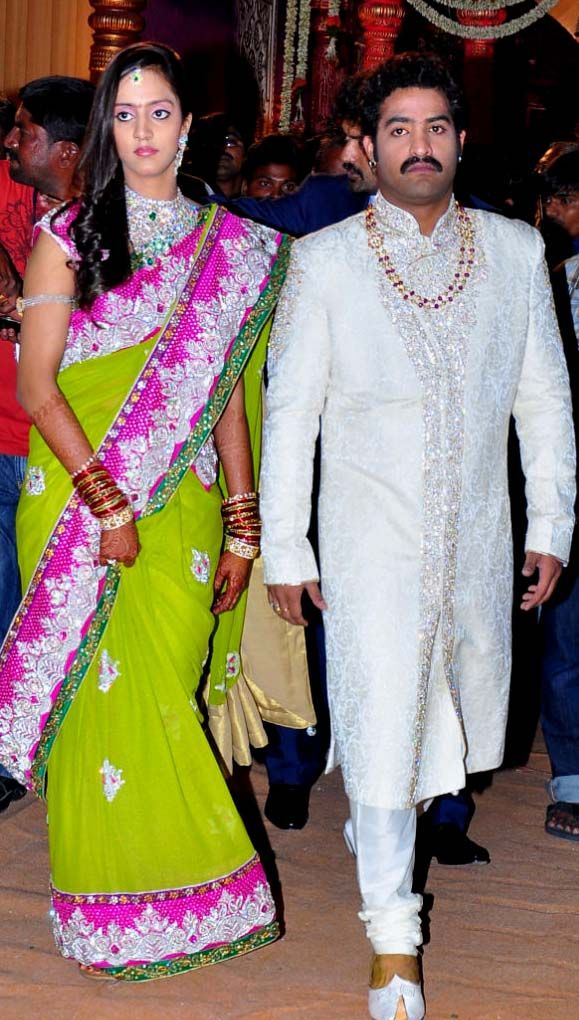 The reception of the much-awaited wedding of Jr NTR -Lakshmi Pranathi held at a grand setting erected at Hitex in Madhapur on Thursday evening. NTR is to tie the knot with Lakshmi Pranathi at 2.41 am (muhurtam) on Friday morning. True to the wishes of NTR the marriage venue resembles the ambience of a royal wedding which is unheard of in Tollywwod.