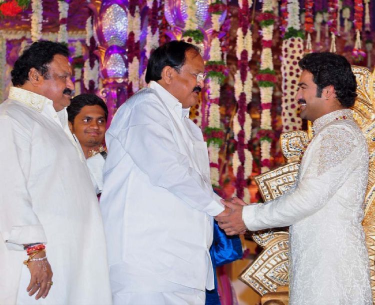 The reception of the much-awaited wedding of Jr NTR -Lakshmi Pranathi held at a grand setting erected at Hitex in Madhapur on Thursday evening. NTR is to tie the knot with Lakshmi Pranathi at 2.41 am (muhurtam) on Friday morning. True to the wishes of NTR the marriage venue resembles the ambience of a royal wedding which is unheard of in Tollywwod.