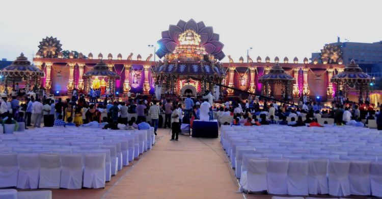 The reception of the much-awaited wedding of Jr NTR -Lakshmi Pranathi held at a grand setting erected at Hitex in Madhapur on Thursday evening. NTR is to tie the knot with Lakshmi Pranathi at 2.41 am (muhurtam) on Friday morning. True to the wishes of NTR the marriage venue resembles the ambience of a royal wedding which is unheard of in Tollywwod.