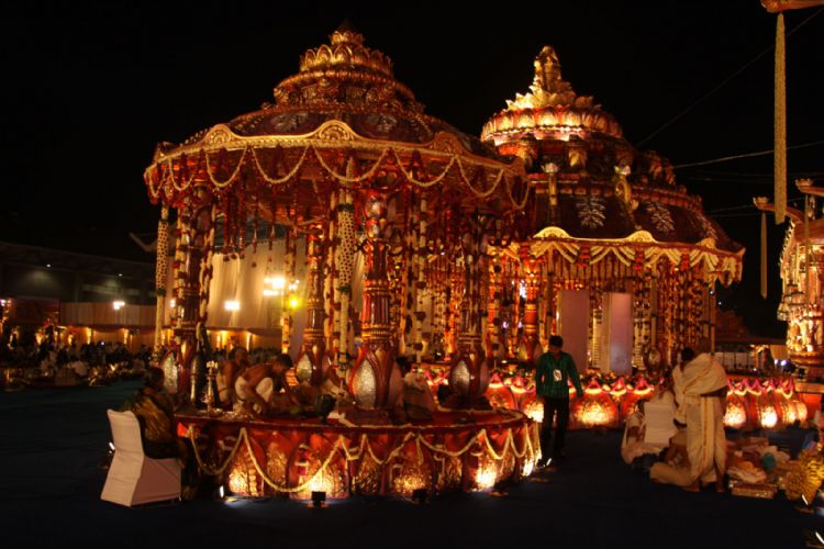 The reception of the much-awaited wedding of Jr NTR -Lakshmi Pranathi held at a grand setting erected at Hitex in Madhapur on Thursday evening. NTR is to tie the knot with Lakshmi Pranathi at 2.41 am (muhurtam) on Friday morning. True to the wishes of NTR the marriage venue resembles the ambience of a royal wedding which is unheard of in Tollywwod.