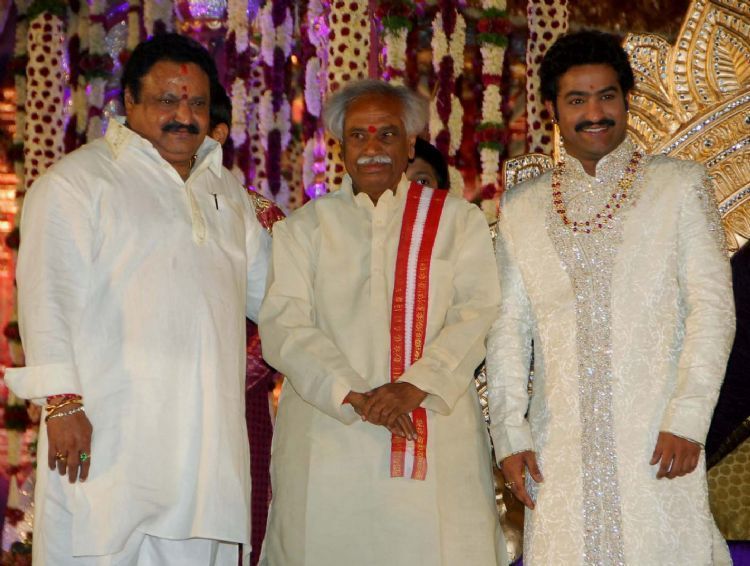 The reception of the much-awaited wedding of Jr NTR -Lakshmi Pranathi held at a grand setting erected at Hitex in Madhapur on Thursday evening. NTR is to tie the knot with Lakshmi Pranathi at 2.41 am (muhurtam) on Friday morning. True to the wishes of NTR the marriage venue resembles the ambience of a royal wedding which is unheard of in Tollywwod.