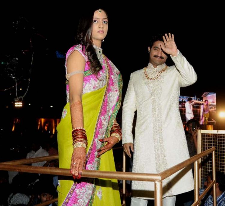 The reception of the much-awaited wedding of Jr NTR -Lakshmi Pranathi held at a grand setting erected at Hitex in Madhapur on Thursday evening. NTR is to tie the knot with Lakshmi Pranathi at 2.41 am (muhurtam) on Friday morning. True to the wishes of NTR the marriage venue resembles the ambience of a royal wedding which is unheard of in Tollywwod.