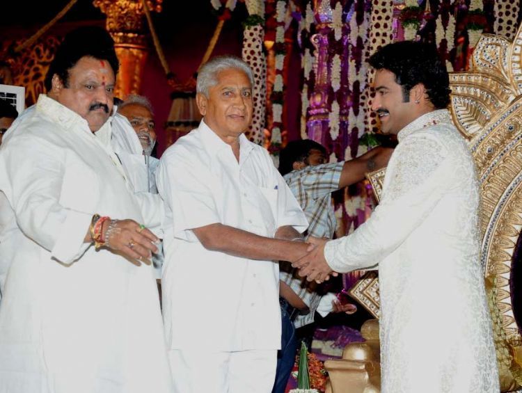 The reception of the much-awaited wedding of Jr NTR -Lakshmi Pranathi held at a grand setting erected at Hitex in Madhapur on Thursday evening. NTR is to tie the knot with Lakshmi Pranathi at 2.41 am (muhurtam) on Friday morning. True to the wishes of NTR the marriage venue resembles the ambience of a royal wedding which is unheard of in Tollywwod.