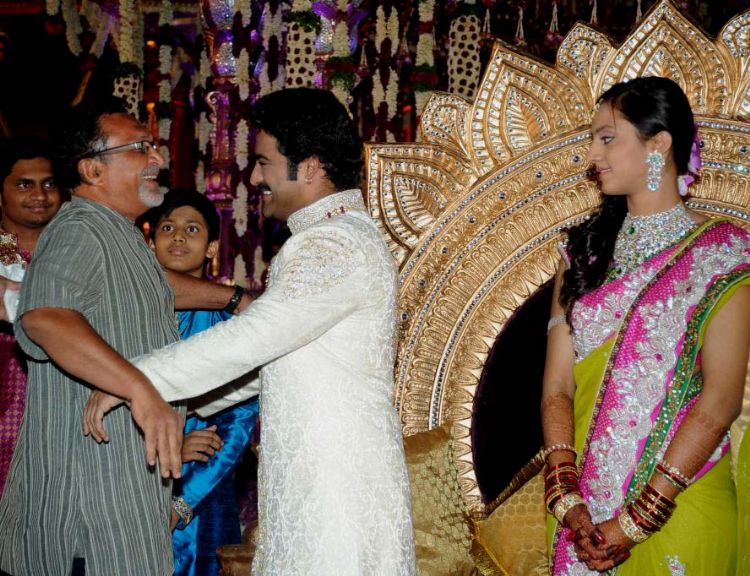 The reception of the much-awaited wedding of Jr NTR -Lakshmi Pranathi held at a grand setting erected at Hitex in Madhapur on Thursday evening. NTR is to tie the knot with Lakshmi Pranathi at 2.41 am (muhurtam) on Friday morning. True to the wishes of NTR the marriage venue resembles the ambience of a royal wedding which is unheard of in Tollywwod.