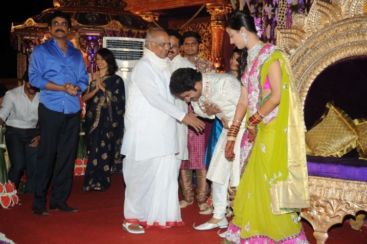 The reception of the much-awaited wedding of Jr NTR -Lakshmi Pranathi held at a grand setting erected at Hitex in Madhapur on Thursday evening. NTR is to tie the knot with Lakshmi Pranathi at 2.41 am (muhurtam) on Friday morning. True to the wishes of NTR the marriage venue resembles the ambience of a royal wedding which is unheard of in Tollywwod.