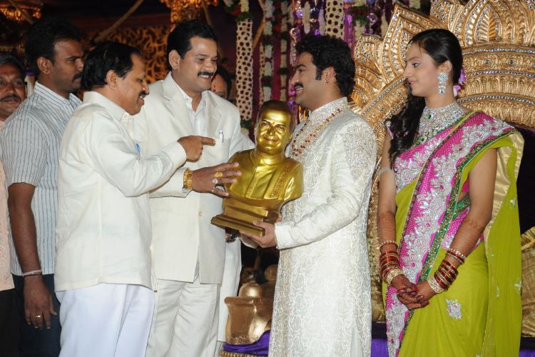 The reception of the much-awaited wedding of Jr NTR -Lakshmi Pranathi held at a grand setting erected at Hitex in Madhapur on Thursday evening. NTR is to tie the knot with Lakshmi Pranathi at 2.41 am (muhurtam) on Friday morning. True to the wishes of NTR the marriage venue resembles the ambience of a royal wedding which is unheard of in Tollywwod.