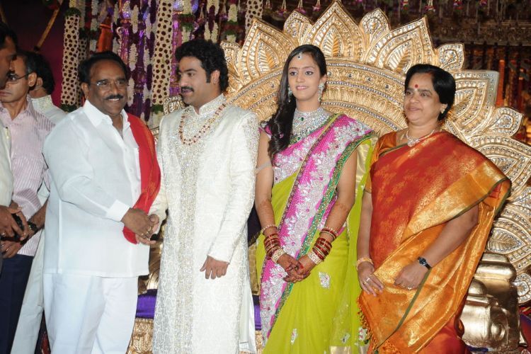 The reception of the much-awaited wedding of Jr NTR -Lakshmi Pranathi held at a grand setting erected at Hitex in Madhapur on Thursday evening. NTR is to tie the knot with Lakshmi Pranathi at 2.41 am (muhurtam) on Friday morning. True to the wishes of NTR the marriage venue resembles the ambience of a royal wedding which is unheard of in Tollywwod.