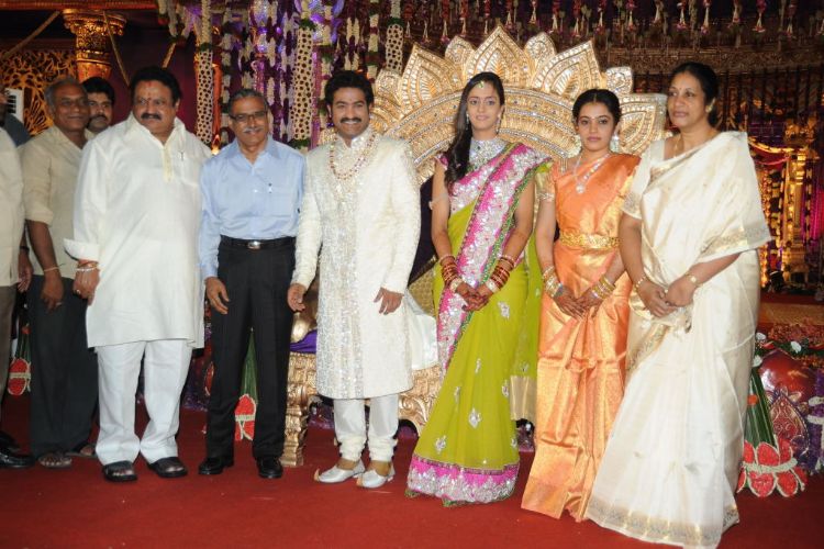 The reception of the much-awaited wedding of Jr NTR -Lakshmi Pranathi held at a grand setting erected at Hitex in Madhapur on Thursday evening. NTR is to tie the knot with Lakshmi Pranathi at 2.41 am (muhurtam) on Friday morning. True to the wishes of NTR the marriage venue resembles the ambience of a royal wedding which is unheard of in Tollywwod.