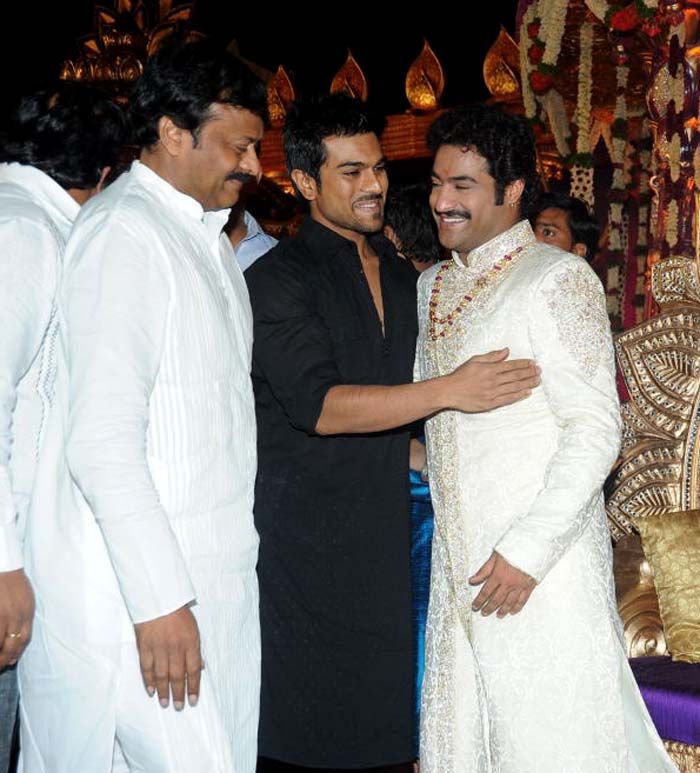 The reception of the much-awaited wedding of Jr NTR -Lakshmi Pranathi held at a grand setting erected at Hitex in Madhapur on Thursday evening. NTR is to tie the knot with Lakshmi Pranathi at 2.41 am (muhurtam) on Friday morning. True to the wishes of NTR the marriage venue resembles the ambience of a royal wedding which is unheard of in Tollywood.