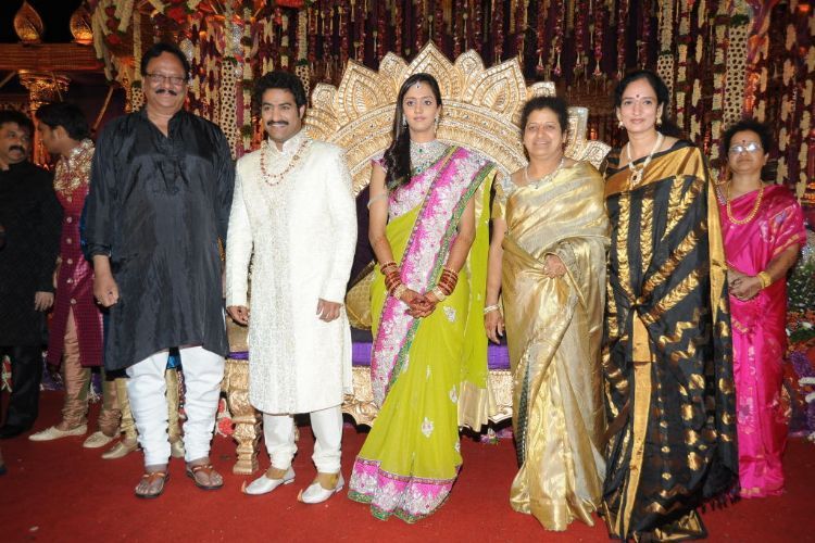 The reception of the much-awaited wedding of Jr NTR -Lakshmi Pranathi held at a grand setting erected at Hitex in Madhapur on Thursday evening. NTR is to tie the knot with Lakshmi Pranathi at 2.41 am (muhurtam) on Friday morning. True to the wishes of NTR the marriage venue resembles the ambience of a royal wedding which is unheard of in Tollywood.