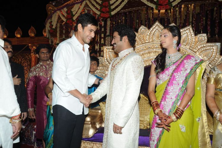 The reception of the much-awaited wedding of Jr NTR -Lakshmi Pranathi held at a grand setting erected at Hitex in Madhapur on Thursday evening. NTR is to tie the knot with Lakshmi Pranathi at 2.41 am (muhurtam) on Friday morning. True to the wishes of NTR the marriage venue resembles the ambience of a royal wedding which is unheard of in Tollywood.