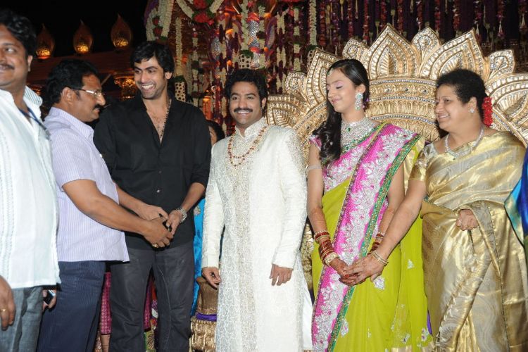 The reception of the much-awaited wedding of Jr NTR -Lakshmi Pranathi held at a grand setting erected at Hitex in Madhapur on Thursday evening. NTR is to tie the knot with Lakshmi Pranathi at 2.41 am (muhurtam) on Friday morning. True to the wishes of NTR the marriage venue resembles the ambience of a royal wedding which is unheard of in Tollywood.