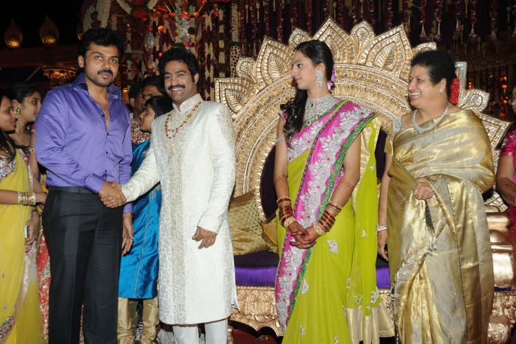 The reception of the much-awaited wedding of Jr NTR -Lakshmi Pranathi held at a grand setting erected at Hitex in Madhapur on Thursday evening. NTR is to tie the knot with Lakshmi Pranathi at 2.41 am (muhurtam) on Friday morning. True to the wishes of NTR the marriage venue resembles the ambience of a royal wedding which is unheard of in Tollywood.