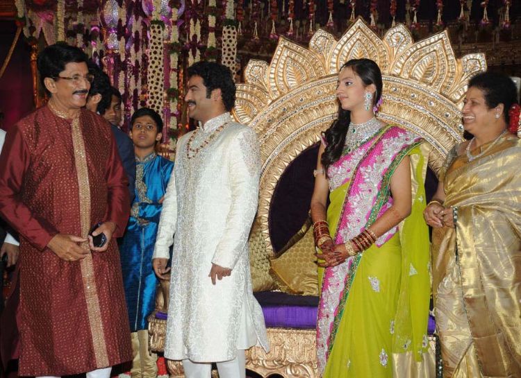 The reception of the much-awaited wedding of Jr NTR -Lakshmi Pranathi held at a grand setting erected at Hitex in Madhapur on Thursday evening. NTR is to tie the knot with Lakshmi Pranathi at 2.41 am (muhurtam) on Friday morning. True to the wishes of NTR the marriage venue resembles the ambience of a royal wedding which is unheard of in Tollywood.