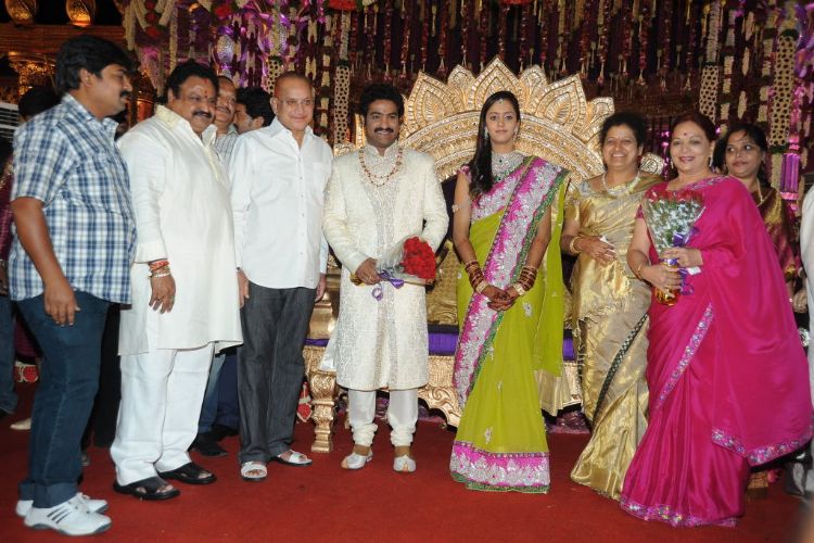 The reception of the much-awaited wedding of Jr NTR -Lakshmi Pranathi held at a grand setting erected at Hitex in Madhapur on Thursday evening. NTR is to tie the knot with Lakshmi Pranathi at 2.41 am (muhurtam) on Friday morning. True to the wishes of NTR the marriage venue resembles the ambience of a royal wedding which is unheard of in Tollywood.