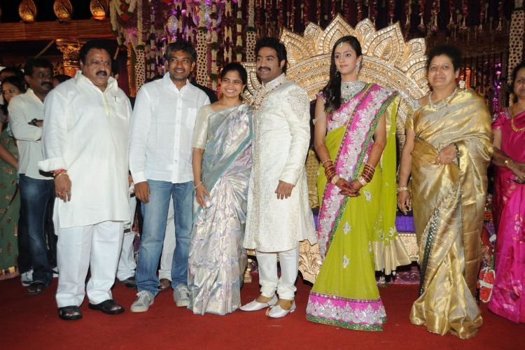 The reception of the much-awaited wedding of Jr NTR -Lakshmi Pranathi held at a grand setting erected at Hitex in Madhapur on Thursday evening. NTR is to tie the knot with Lakshmi Pranathi at 2.41 am (muhurtam) on Friday morning. True to the wishes of NTR the marriage venue resembles the ambience of a royal wedding which is unheard of in Tollywood.