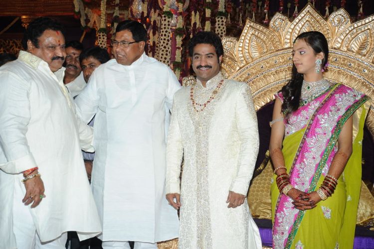 The reception of the much-awaited wedding of Jr NTR -Lakshmi Pranathi held at a grand setting erected at Hitex in Madhapur on Thursday evening. NTR is to tie the knot with Lakshmi Pranathi at 2.41 am (muhurtam) on Friday morning. True to the wishes of NTR the marriage venue resembles the ambience of a royal wedding which is unheard of in Tollywood.