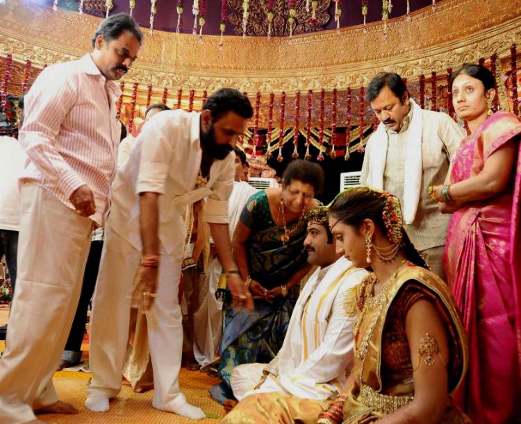 Popular actor NTR Jr. tied the nuptial knot with Lakshmi Pranathi at an auspicious time of 2.41 a.m. on Friday at Hitex in Madhapur. A team of 36 priests from East Godavari district led by Junior NTR's personal astrologer Karuparthi Koteswara Rao Sidhanti performed the wedding.