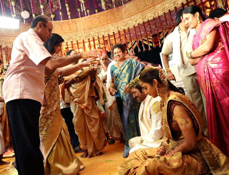 Popular actor NTR Jr. tied the nuptial knot with Lakshmi Pranathi at an auspicious time of 2.41 a.m. on Friday at Hitex in Madhapur. A team of 36 priests from East Godavari district led by Junior NTR's personal astrologer Karuparthi Koteswara Rao Sidhanti performed the wedding.