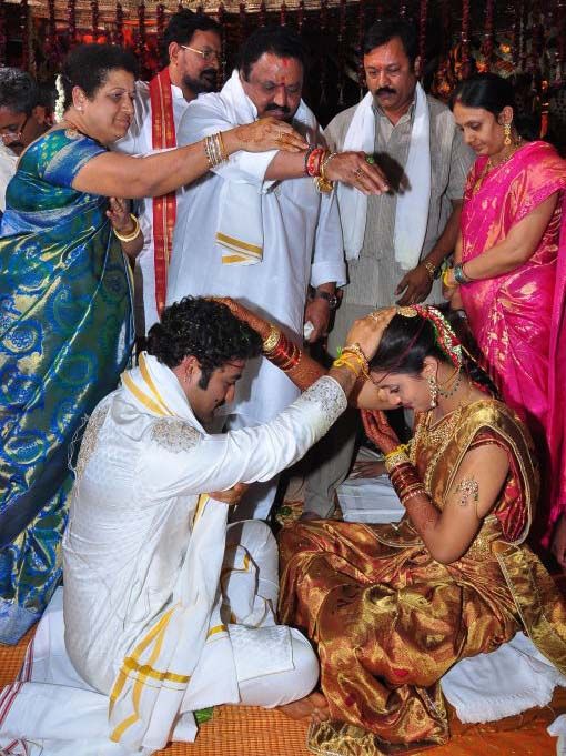 Popular actor NTR Jr. tied the nuptial knot with Lakshmi Pranathi at an auspicious time of 2.41 a.m. on Friday at Hitex in Madhapur. A team of 36 priests from East Godavari district led by Junior NTR's personal astrologer Karuparthi Koteswara Rao Sidhanti performed the wedding.