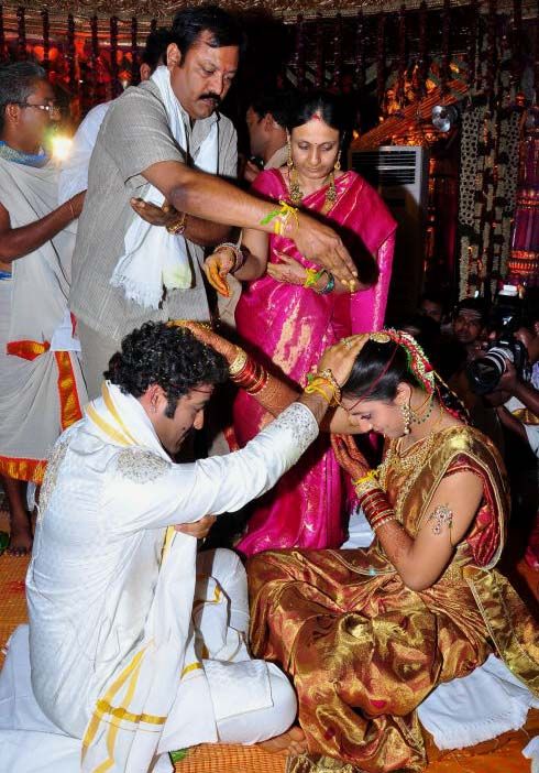 Popular actor NTR Jr. tied the nuptial knot with Lakshmi Pranathi at an auspicious time of 2.41 a.m. on Friday at Hitex in Madhapur. A team of 36 priests from East Godavari district led by Junior NTR's personal astrologer Karuparthi Koteswara Rao Sidhanti performed the wedding.