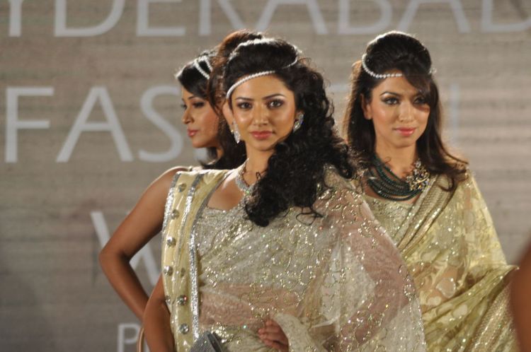 Models flaunt different outfits at Hyderabad Fashion Week held at hotel Marriot.