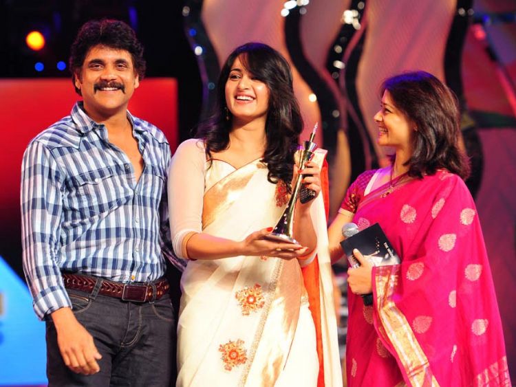 Star-studded event: Actors Nandamuri Balakrishna, Nagarjuna, Amala, Allu Arjun, Ramcharan Teja, Priya Mani, Anushka, Vishnu and Namita during the MAA cinema awards function held in Hyderabad on Sunday.