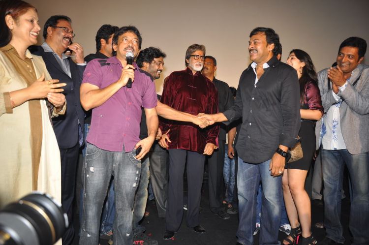 SPARKLING STARS: Amitabh Bachchan greets Chiranjeevi with a bear hug at the preview of his film ‘Bbuddah Hoga Tera Baap' in city on Thursday night. Actors Sonu Sood, Charmee and Prakash Raj are seen.
