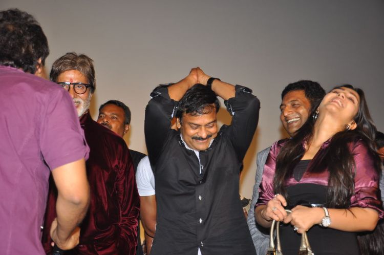 SPARKLING STARS: Amitabh Bachchan greets Chiranjeevi with a bear hug at the preview of his film ‘Bbuddah Hoga Tera Baap' in city on Thursday night. Actors Sonu Sood, Charmee and Prakash Raj are seen.