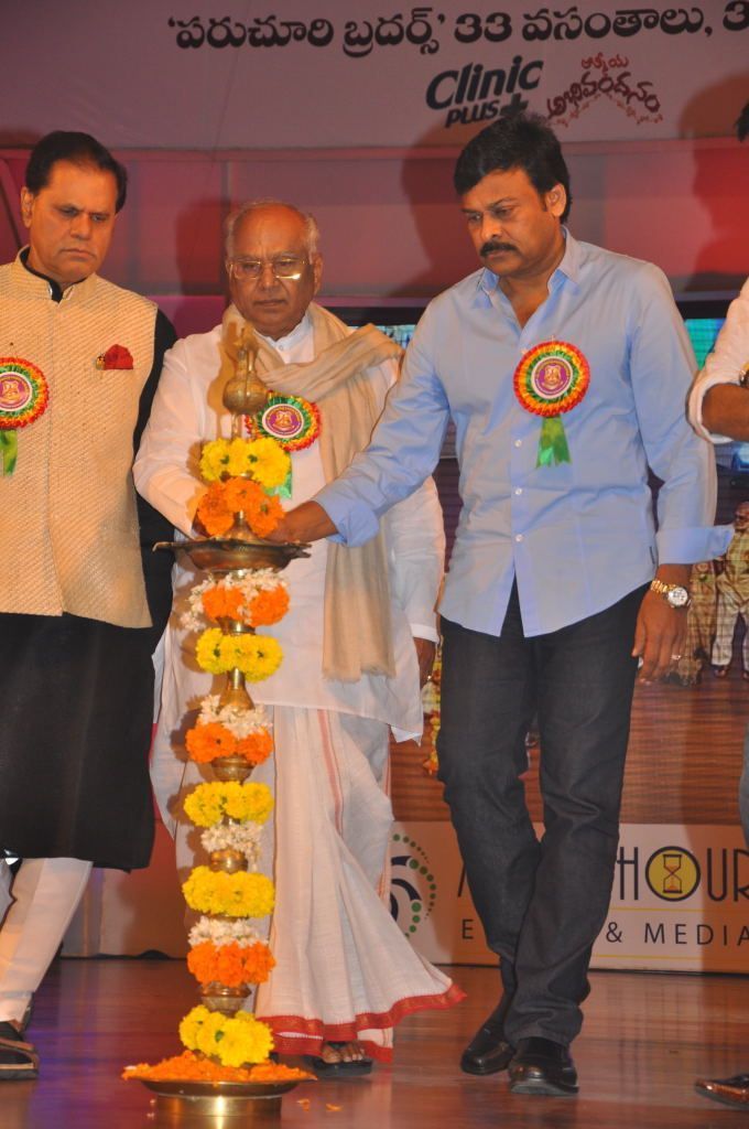 Moment of pride: Leading lights of the Telugu film fraternity conferring ‘Viswa Vikhyata Rachana Sarvabhoumulu' to Paruchuri Brothers, Venkateswara Rao and Gopalakrishna, in Hyderabad on Sunday. The event was organised by T. Subbarami Reddy Lalithakala Parishat.