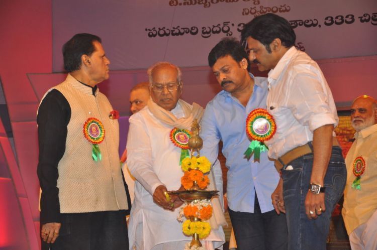 Moment of pride: Leading lights of the Telugu film fraternity conferring ‘Viswa Vikhyata Rachana Sarvabhoumulu' to Paruchuri Brothers, Venkateswara Rao and Gopalakrishna, in Hyderabad on Sunday. The event was organised by T. Subbarami Reddy Lalithakala Parishat.