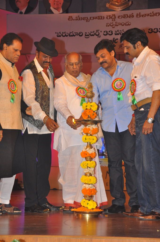 Moment of pride: Leading lights of the Telugu film fraternity conferring ‘Viswa Vikhyata Rachana Sarvabhoumulu' to Paruchuri Brothers, Venkateswara Rao and Gopalakrishna, in Hyderabad on Sunday. The event was organised by T. Subbarami Reddy Lalithakala Parishat.
