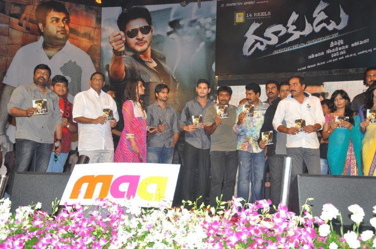 Mahesh Babu's much awaited film Dookudu audio was launched at Silpakala Vedika in Madhapur. Mahesh Babu along with his wife Namrata and noted film personalities like Rajamouli, Sukumar, Hanumatha Rao along with the films cast Samntha, director Srinu Vytla graced the event.