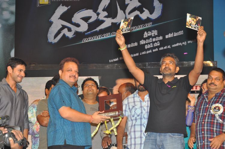 Mahesh Babu's much awaited film Dookudu audio was launched at Silpakala Vedika in Madhapur. Mahesh Babu along with his wife Namrata and noted film personalities like Rajamouli, Sukumar, Hanumatha Rao along with the films cast Samntha, director Srinu Vytla graced the event.