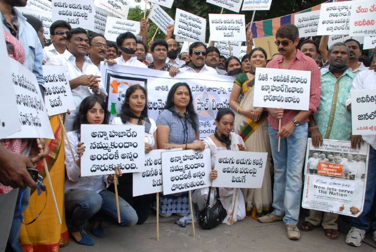 Telugu film stars joined the chorus against corruption with a protest rally and satyagraha to be organised at Filmnagar on Friday. Responding to a call given by The Movie Artistes Association (MAA) actors, producers, directors, film workers and others associated with the film industry joined the protest.