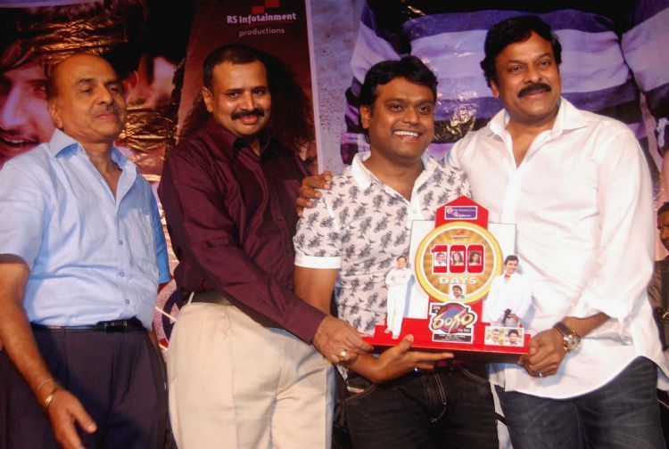 Jiva, Karthika starrer Rangam film's 100 days celebrations were held in Big Cinema theater at Tirupati on a grand scale. Chiranjeevi has graced the function as chief guest and presented memos to the film's cast and crew. SuperGood Films RB Choudary and RS Infotainement on which banner the film was produced profusely thanked Chiranjeevi for his presence.