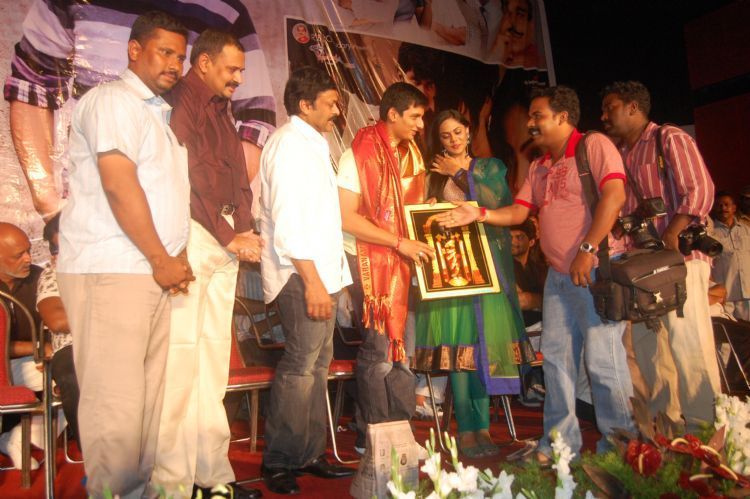 Jiva, Karthika starrer Rangam film's 100 days celebrations were held in Big Cinema theater at Tirupati on a grand scale. Chiranjeevi has graced the function as chief guest and presented memos to the film's cast and crew. SuperGood Films RB Choudary and RS Infotainement on which banner the film was produced profusely thanked Chiranjeevi for his presence.