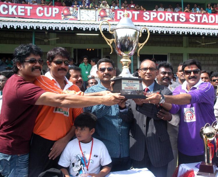 Tollywood Stars charity cricket match was held in Anantapur on Sunday. Teams represented by Nandamuri Balakrishna and Nagarjuna played a nail biting limited over match. Nagarjuna team won the Cresent Crikcet Tropy.