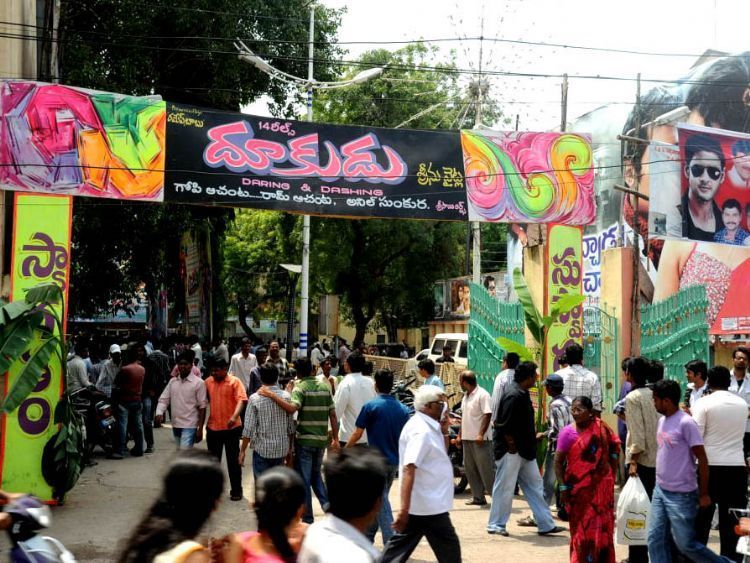Dookudu release marks celebration and jubiliation among Mahesh Babu fans gathered at various theaters in Hyd.
