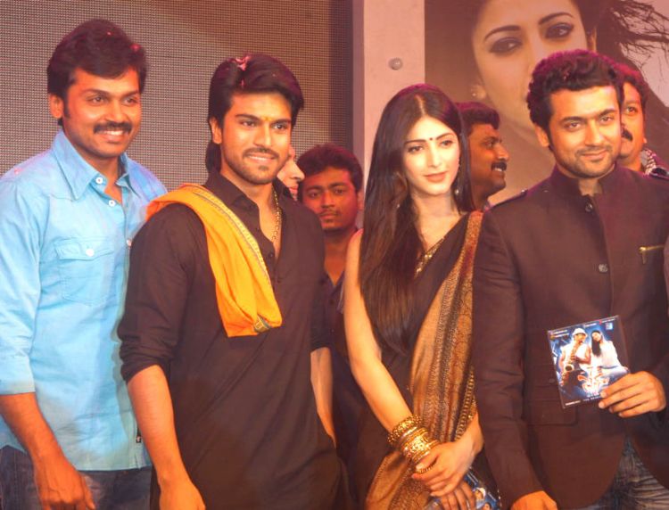 The audio launch of 7th Sense starring Suriya and Shruti Hassan saw the cream of Telugu cinema come to support Suriya, Murugadoss, and Shruti for the movie. The launch saw personalities like Rajamouli, Ram Charan, Allu Arvind, Allu Arjun, and Nikitha wish them luck for the movie. Apart from this, Karthi was also seen accompanying Suriya in high spirits. Suriya was seen being very friendly with Ram Charan Tej and Allu Arjun, showing the close bonding between the stars.