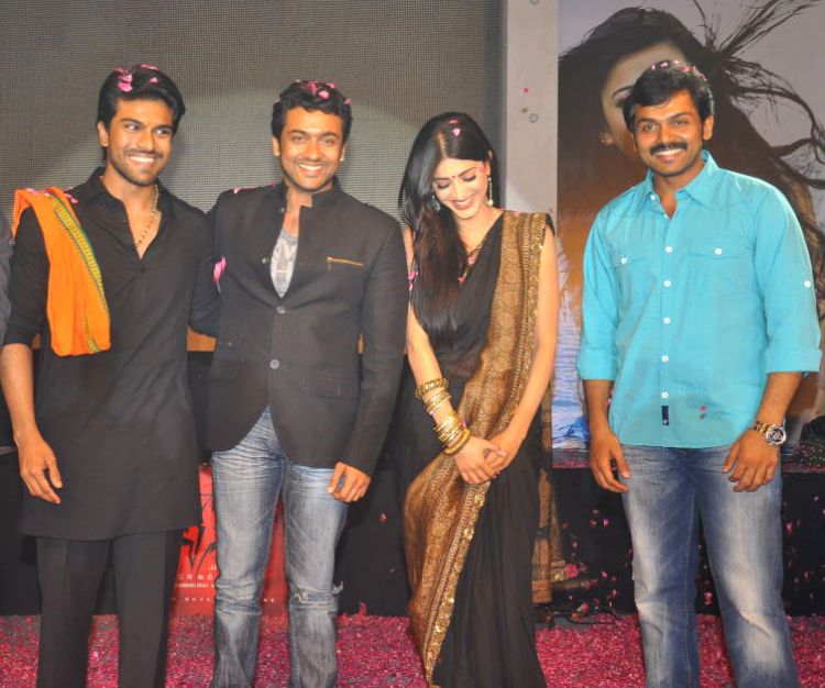The audio launch of 7th Sense starring Suriya and Shruti Hassan saw the cream of Telugu cinema come to support Suriya, Murugadoss, and Shruti for the movie. The launch saw personalities like Rajamouli, Ram Charan, Allu Arvind, Allu Arjun, and Nikitha wish them luck for the movie. Apart from this, Karthi was also seen accompanying Suriya in high spirits. Suriya was seen being very friendly with Ram Charan Tej and Allu Arjun, showing the close bonding between the stars.