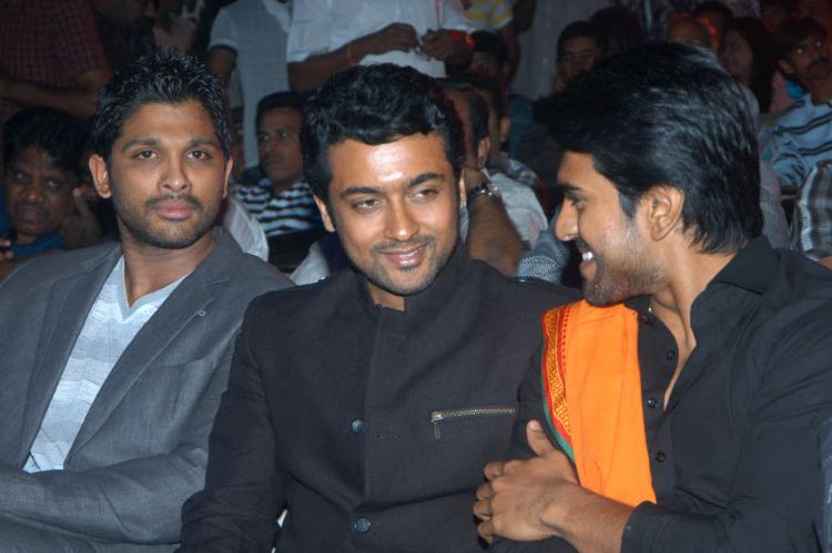 The audio launch of 7th Sense starring Suriya and Shruti Hassan saw the cream of Telugu cinema come to support Suriya, Murugadoss, and Shruti for the movie. The launch saw personalities like Rajamouli, Ram Charan, Allu Arvind, Allu Arjun, and Nikitha wish them luck for the movie. Apart from this, Karthi was also seen accompanying Suriya in high spirits. Suriya was seen being very friendly with Ram Charan Tej and Allu Arjun, showing the close bonding between the stars.