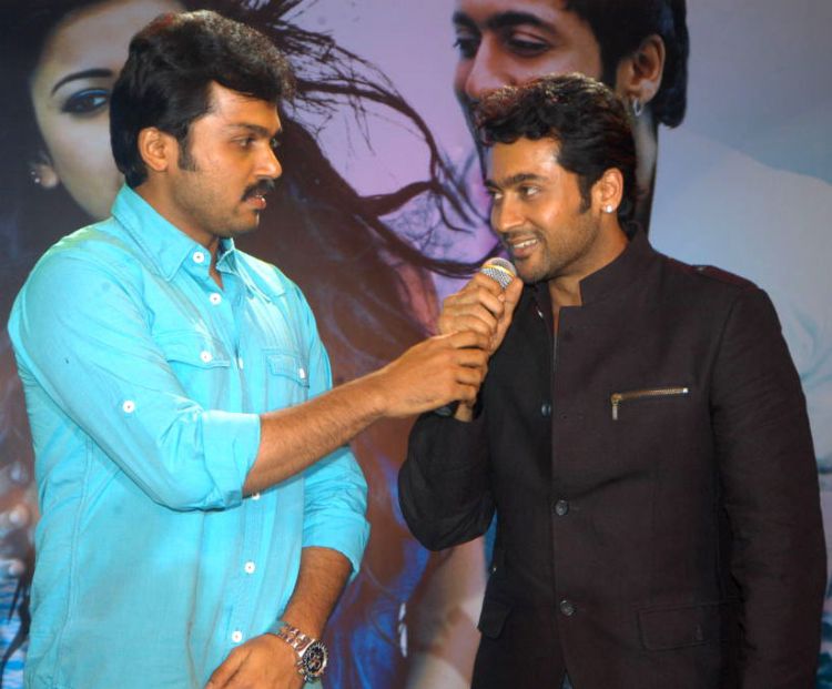 The audio launch of 7th Sense starring Suriya and Shruti Hassan saw the cream of Telugu cinema come to support Suriya, Murugadoss, and Shruti for the movie. The launch saw personalities like Rajamouli, Ram Charan, Allu Arvind, Allu Arjun, and Nikitha wish them luck for the movie. Apart from this, Karthi was also seen accompanying Suriya in high spirits. Suriya was seen being very friendly with Ram Charan Tej and Allu Arjun, showing the close bonding between the stars.